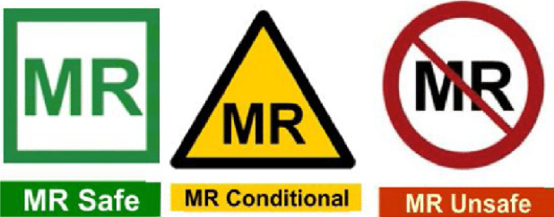 2. MR conditional – No MR-related hazards to patients or staff when used in MR setting under specific conditions – e.g. static field strength, rate of change of magnetic field.