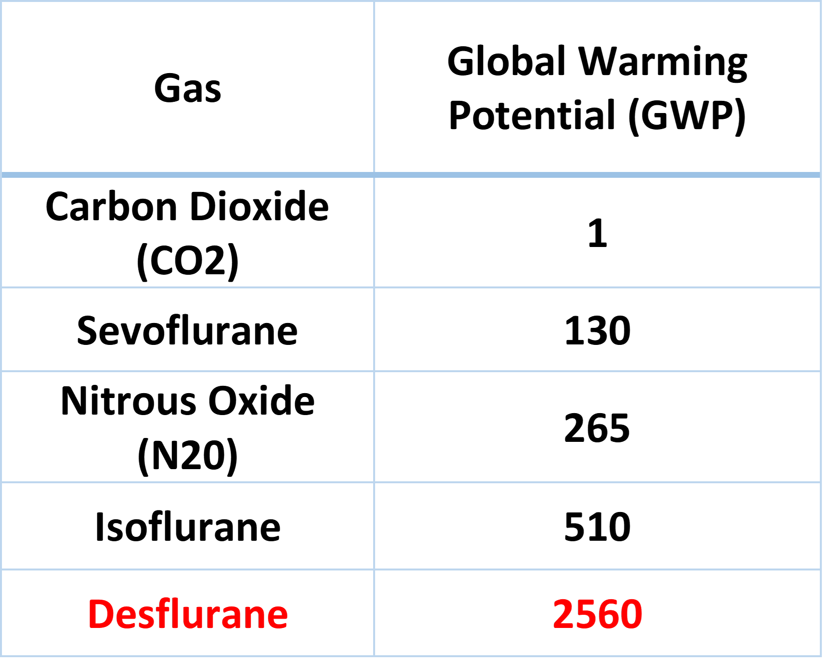 The table on the left ranks GWP potential of gases commonly found in anaesthesia.