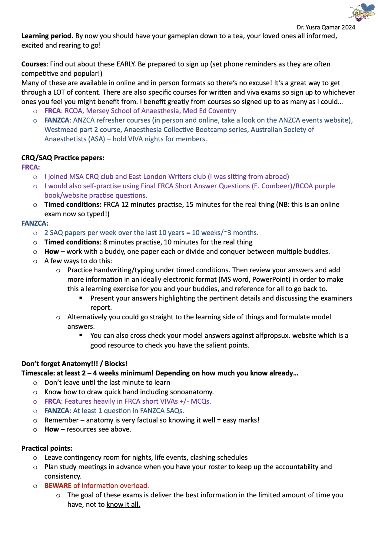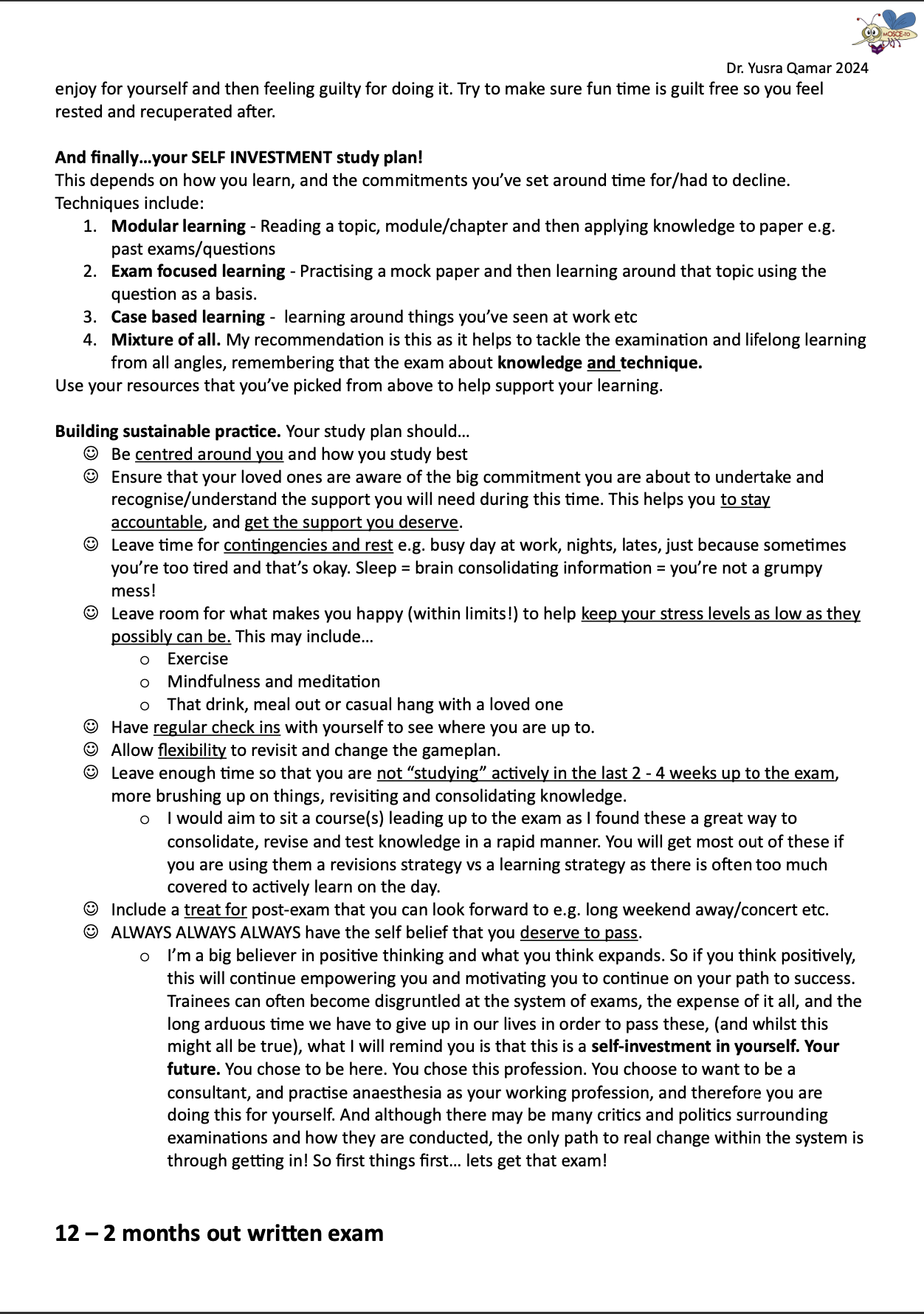 Use this as a comprehensive guide full of helpful resources, tips, theoretical and practical strategies to help you ace your anaesthesia exams with preparation and confidence! Keep coming back to it for support and motivation as you continue to progress through your journey. Good luck!